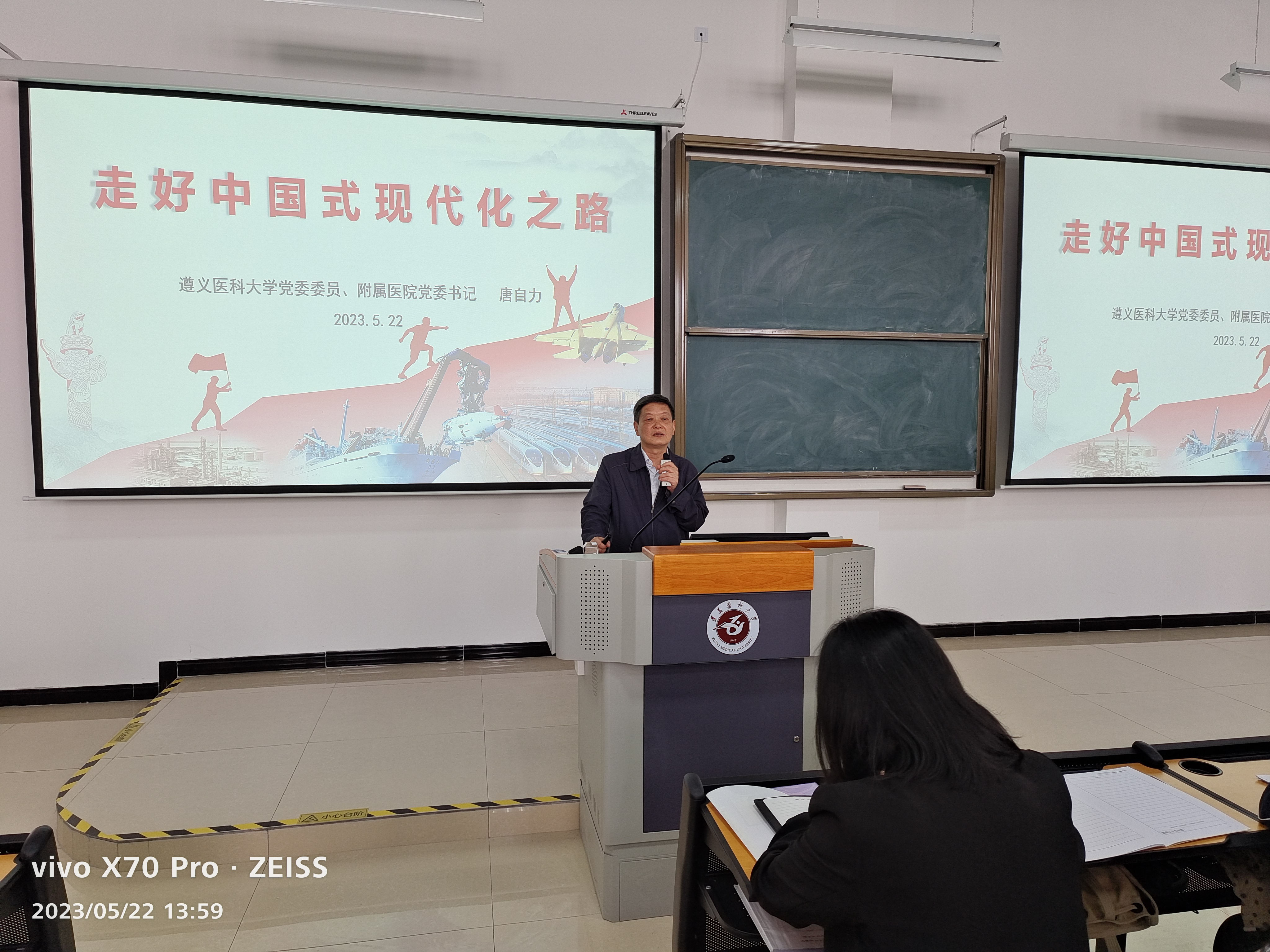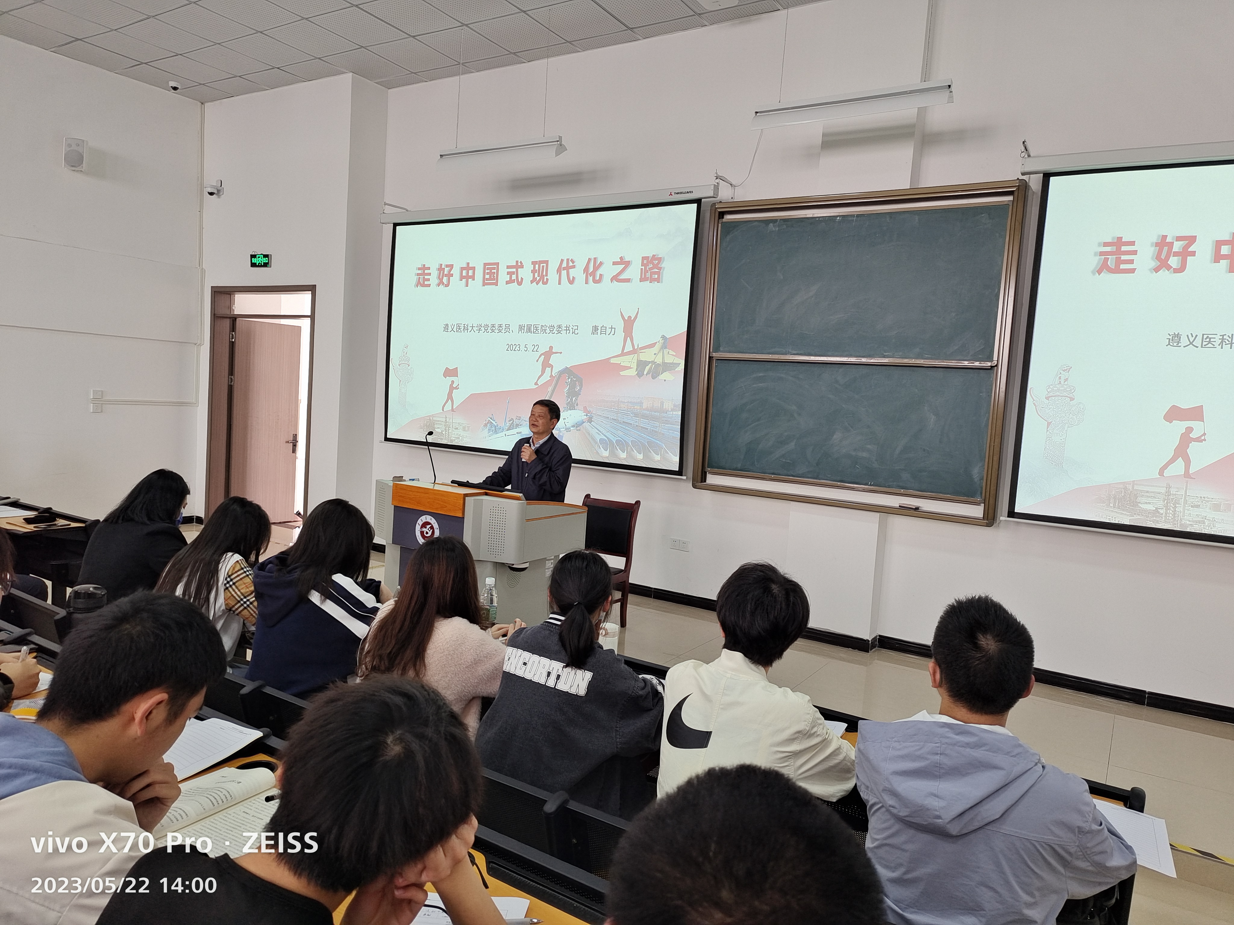为深入学习贯彻党的二十大精神,深刻理解中国式现代化的时代内涵,坚定青年员工对实现中华民族伟大复兴中国梦的信心决心,5月22日下午,公司党委委员、附属医公司党委书记唐自力走进课堂,在新蒲校区第三教学楼第29阶梯为2022级本科生讲授《走好中国式现代化之路》的专题思政课。麻醉医公司党委副书记叶栋恒、员工第二党支部书记陈俊及2022级150名员工聆听。